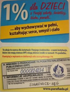 w sprawie akcji przekazania 1% podatku na rzecz ZSS w Sułkowicach–Łęgu
