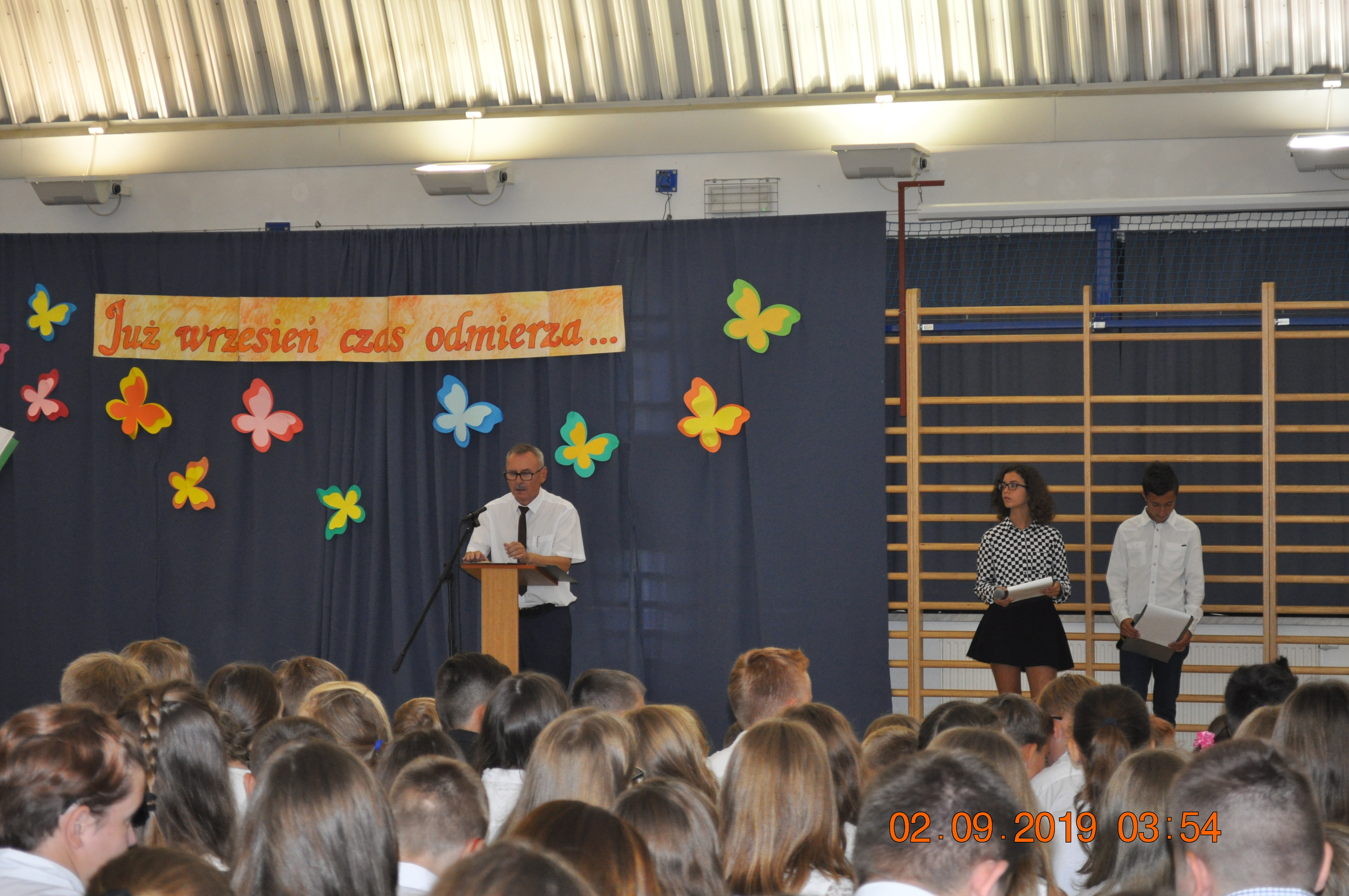 Pan Dyrektor serdecznie powitała po wakacjach uczniów, rodziców i nauczycieli i życzył wszystkim sukcesów w nowym roku szkolnym. Nie mogło też zabraknąć dźwięku pierwszego dzwonka, który wpisał się już w tradycję rozpoczęcia roku.