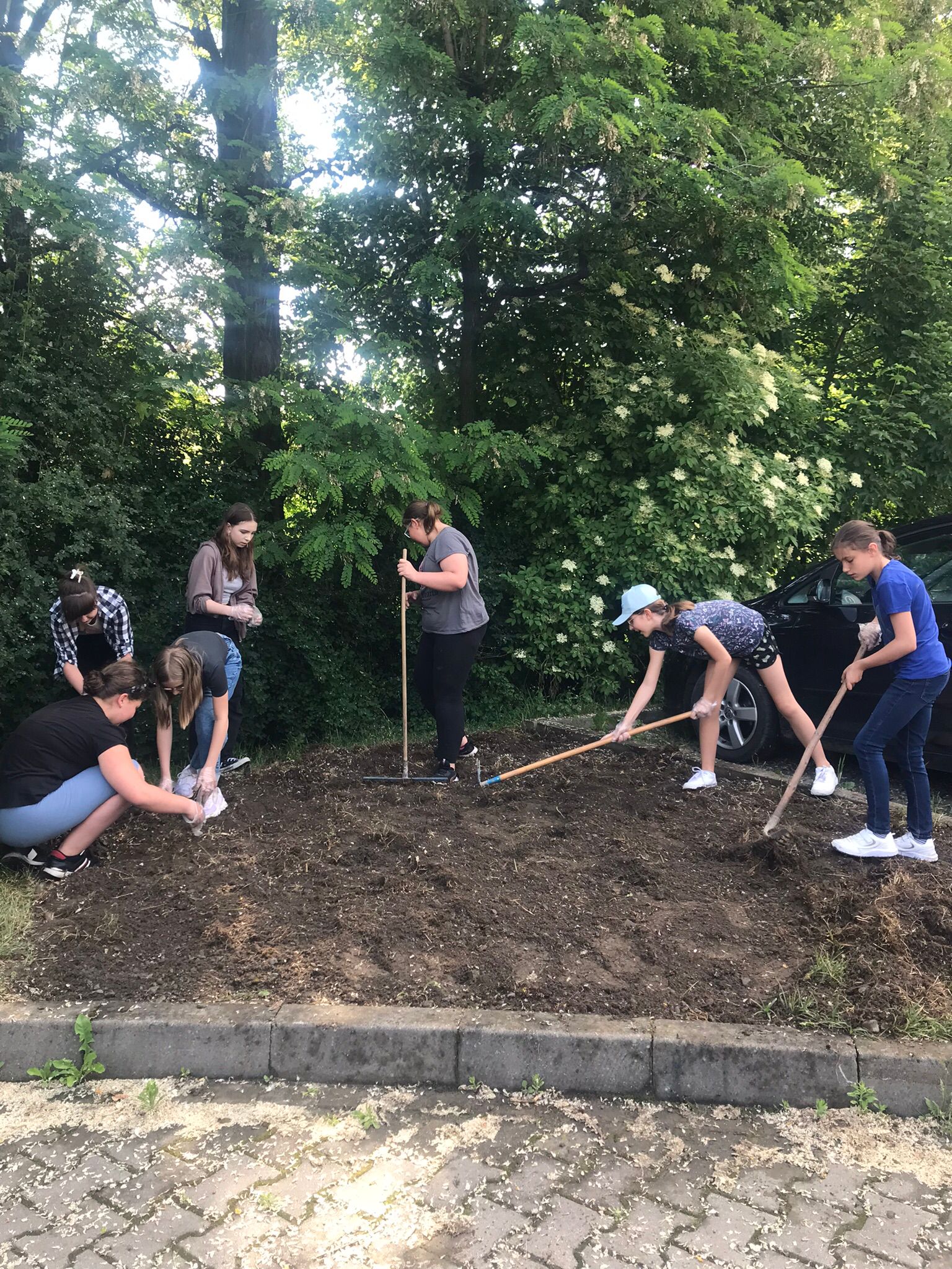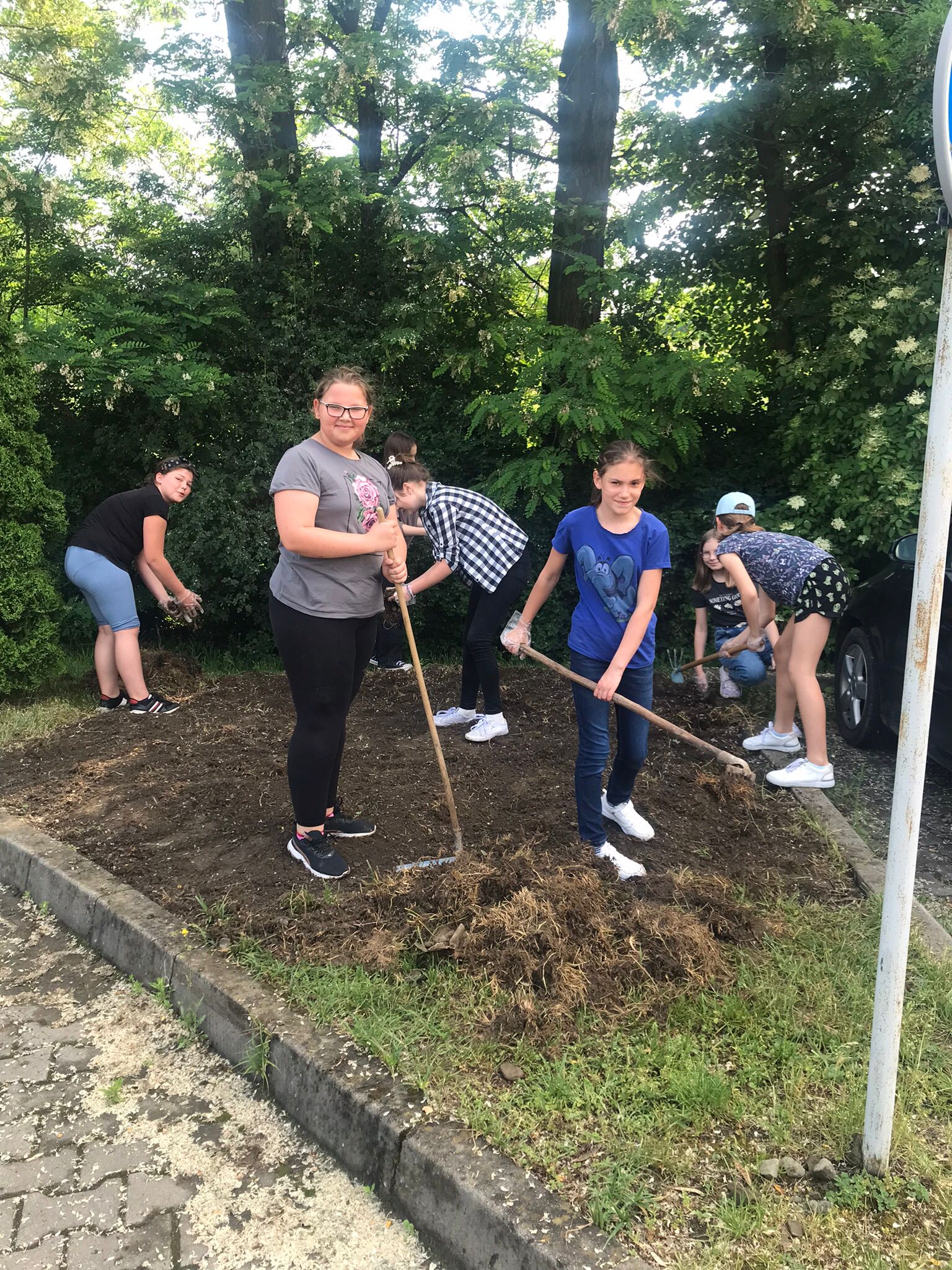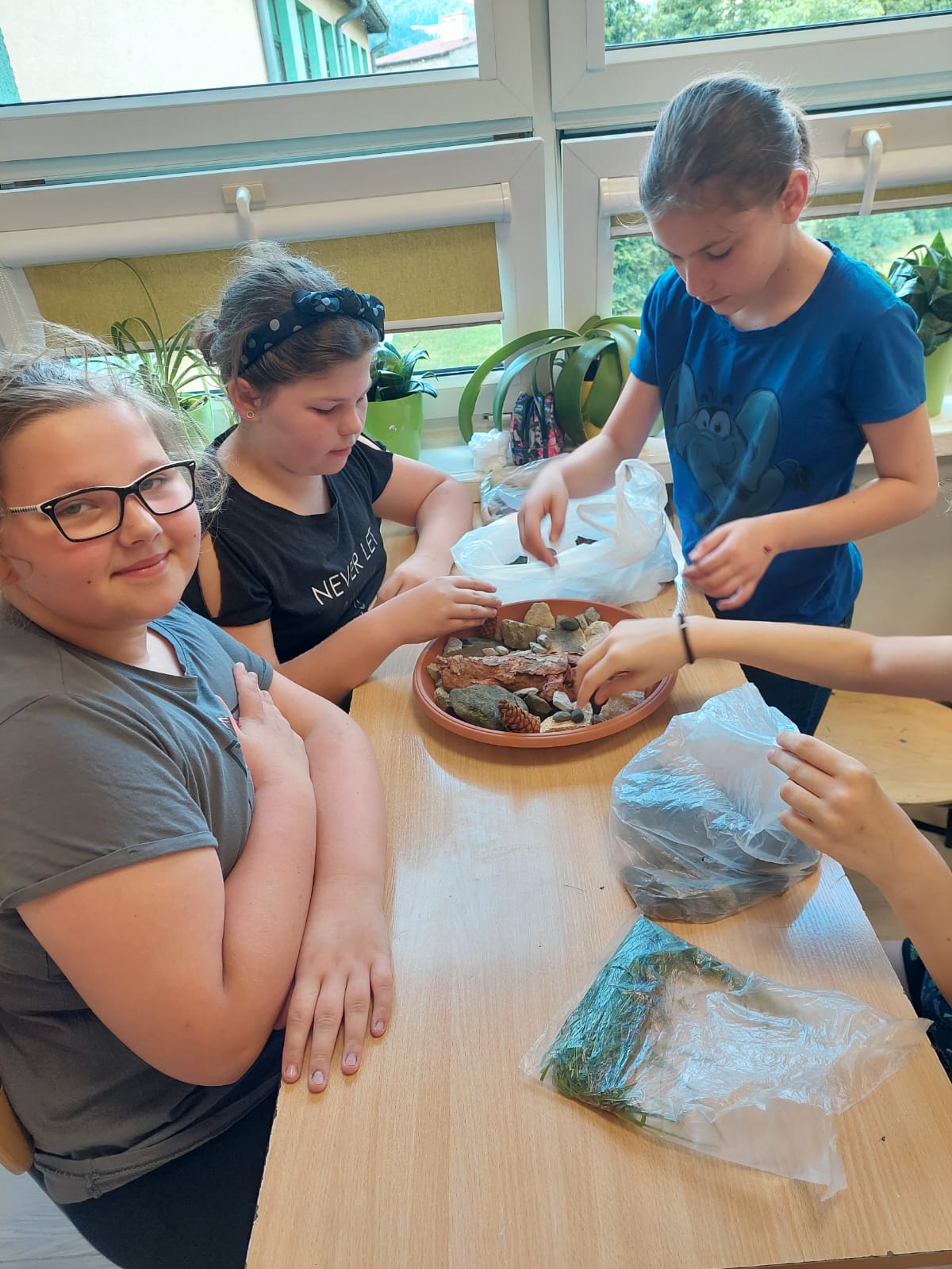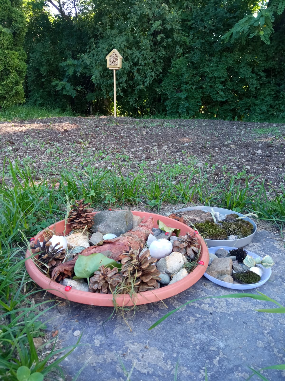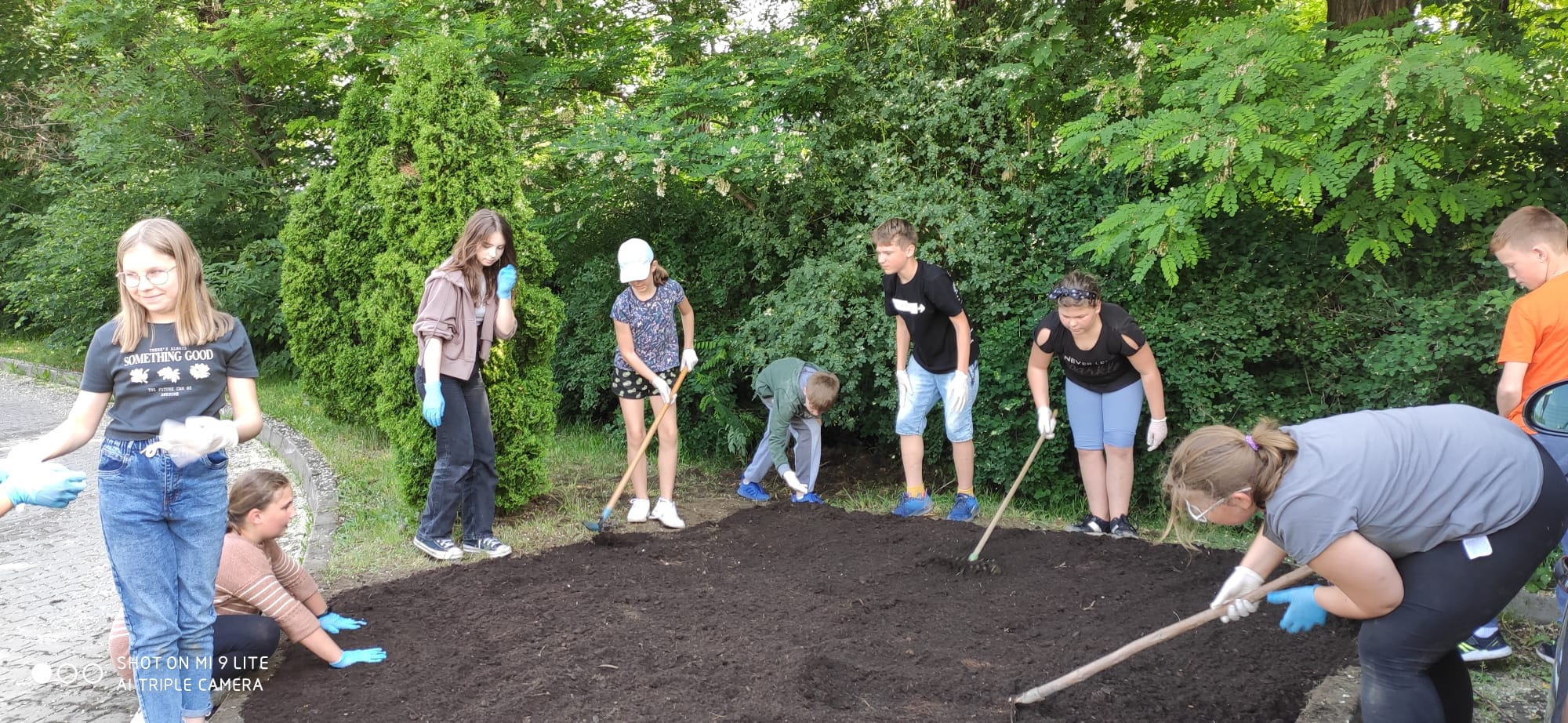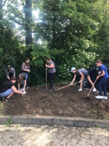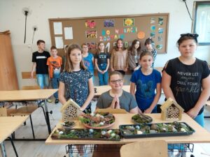 Przed halą sportową, w dwóch miejscach, posialiśmy miododajne rośliny na kwietne łączki. Miejsca te zostały dodatkowo wzbogacone wykonanymi przez uczniów domkami oraz poidełkami dla pszczół. Liczymy, że praca uczniów zaowocuje pojawieniem się tam tych owadów. Ponadto, uczniowie zredagowali w grupach listy otwarte: