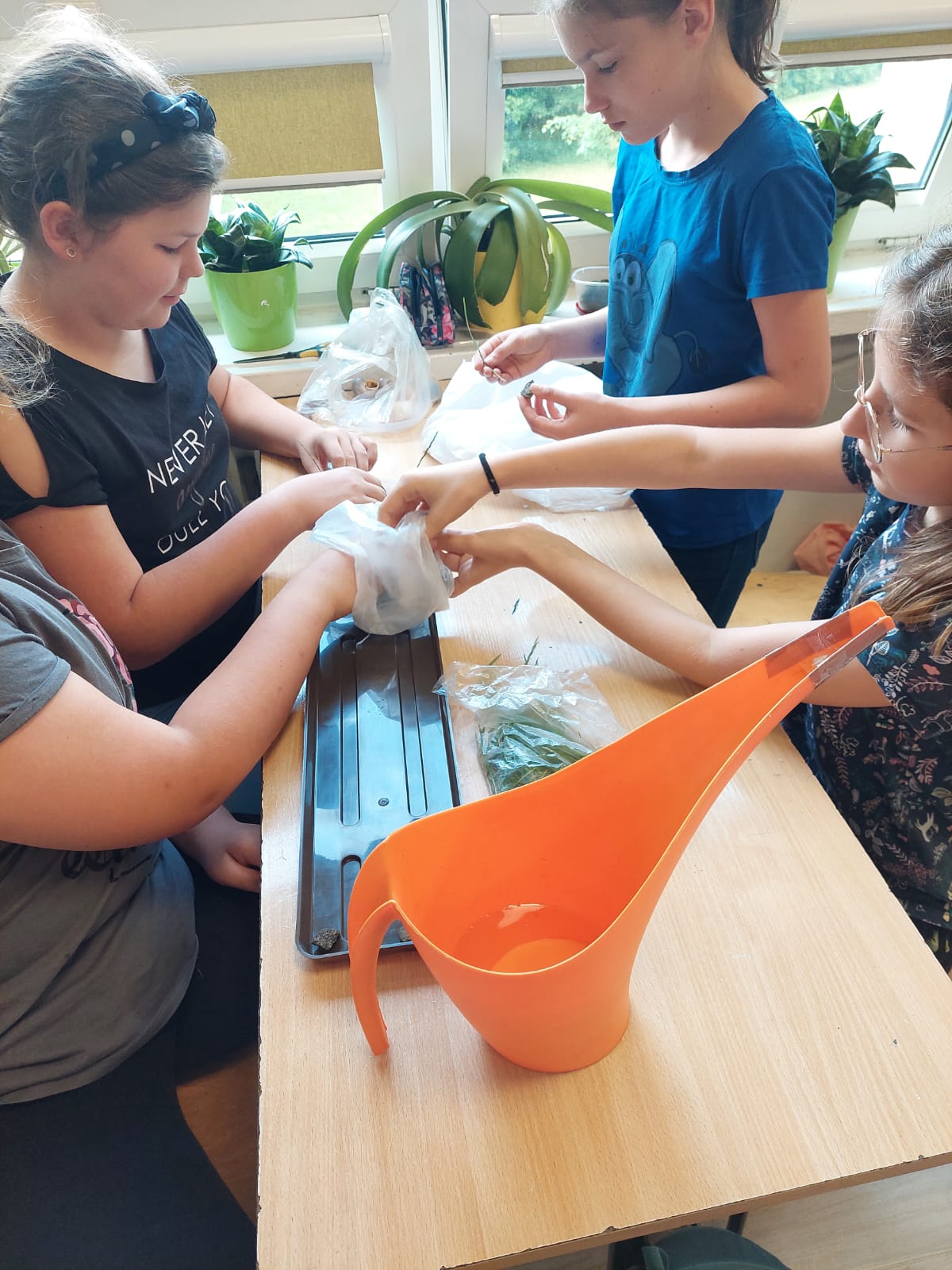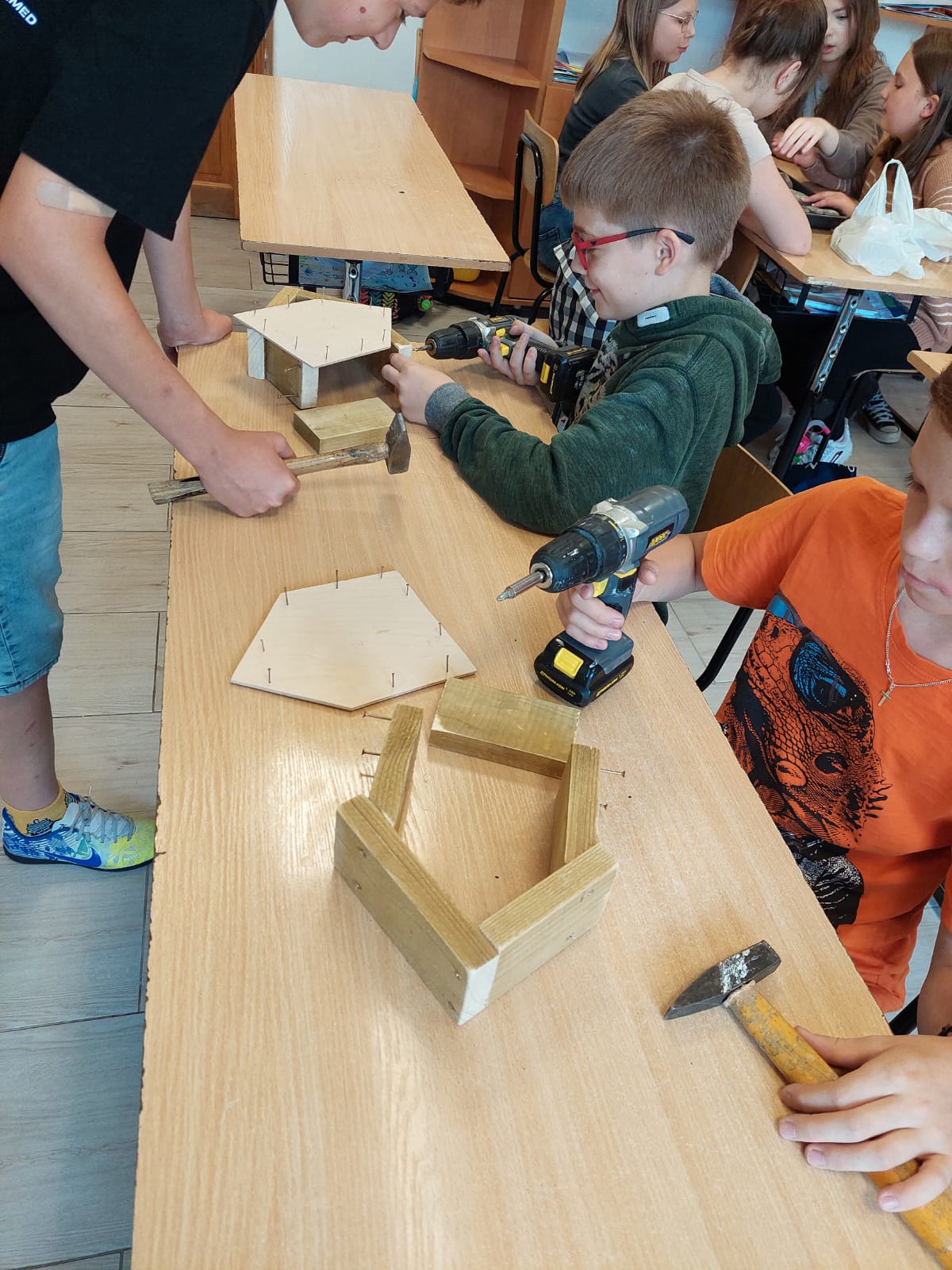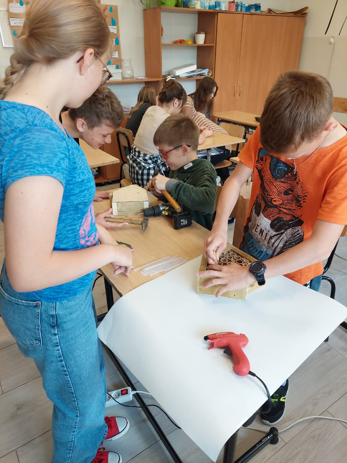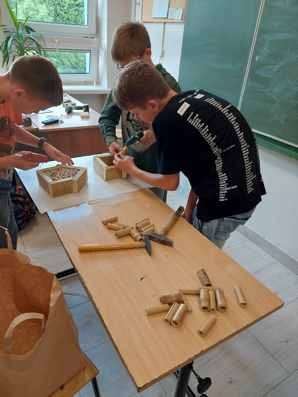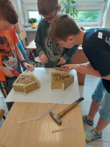 Zaraz po powrocie, na gorąco, przystąpiliśmy do wdrażania tego, czego się nauczyliśmy. I tak – od 19 maja uczniowie klasy 5a podjęli, pod opieką nauczycieli biologii, języka polskiego i techniki, próbę odpowiedzi na pytanie „Jak możemy pomóc pszczołom?”. Do rozwiązania problemu została zastosowana właśnie nowo poznana metoda.