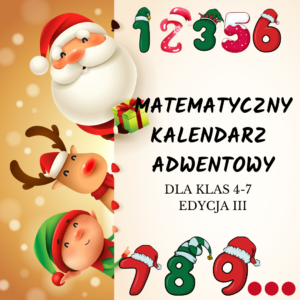 Już za chwile, już za momencik, bo 1 grudnia rozpocznie się trzecia już z kolei edycja Adwentowego Konkursu Matematycznego dla klas 4-7. Konkurs również i w tym roku cieszy się ogromnym zainteresowaniem uczniów. Przed uczestnikami aż 24 dni zmagań z 24 zadaniami matematycznymi i logicznymi zagadkami. uczniowie muszą się wykazać nie tylko wiedzą matematyczna, umiejętnością logicznego myślenia, ale również systematycznością, cierpliwością oraz umiejętnościami technicznymi, gdyż konkurs prowadzony jest w formie online.