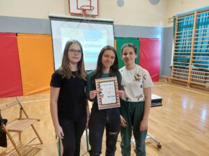 – III miejsce zdobyła drużyna z klasy 8d w składzie Patrycja Wykręt, Magdalena Hajost, Martyna Zielińska uzyskując 29 punktów.