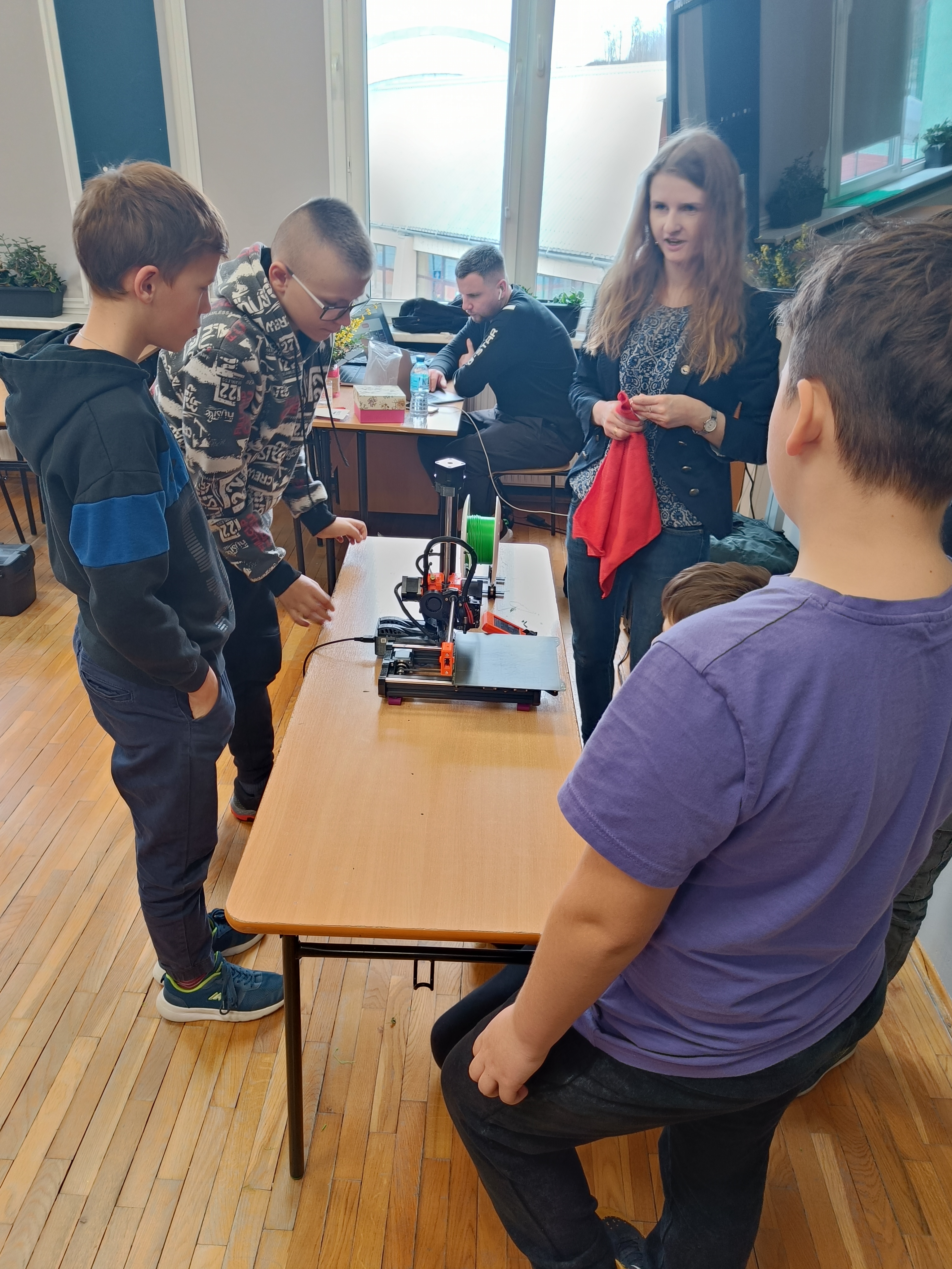 Podczas warsztatów uczniowie zgłębiali tematykę druku 3D. Zapoznali się z budową drukarki,