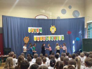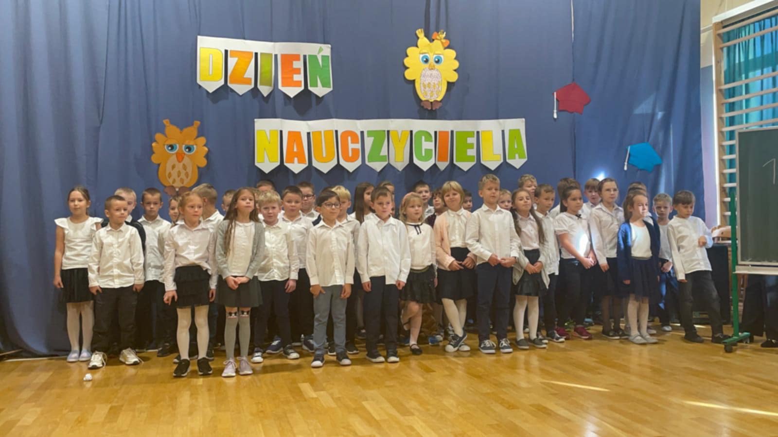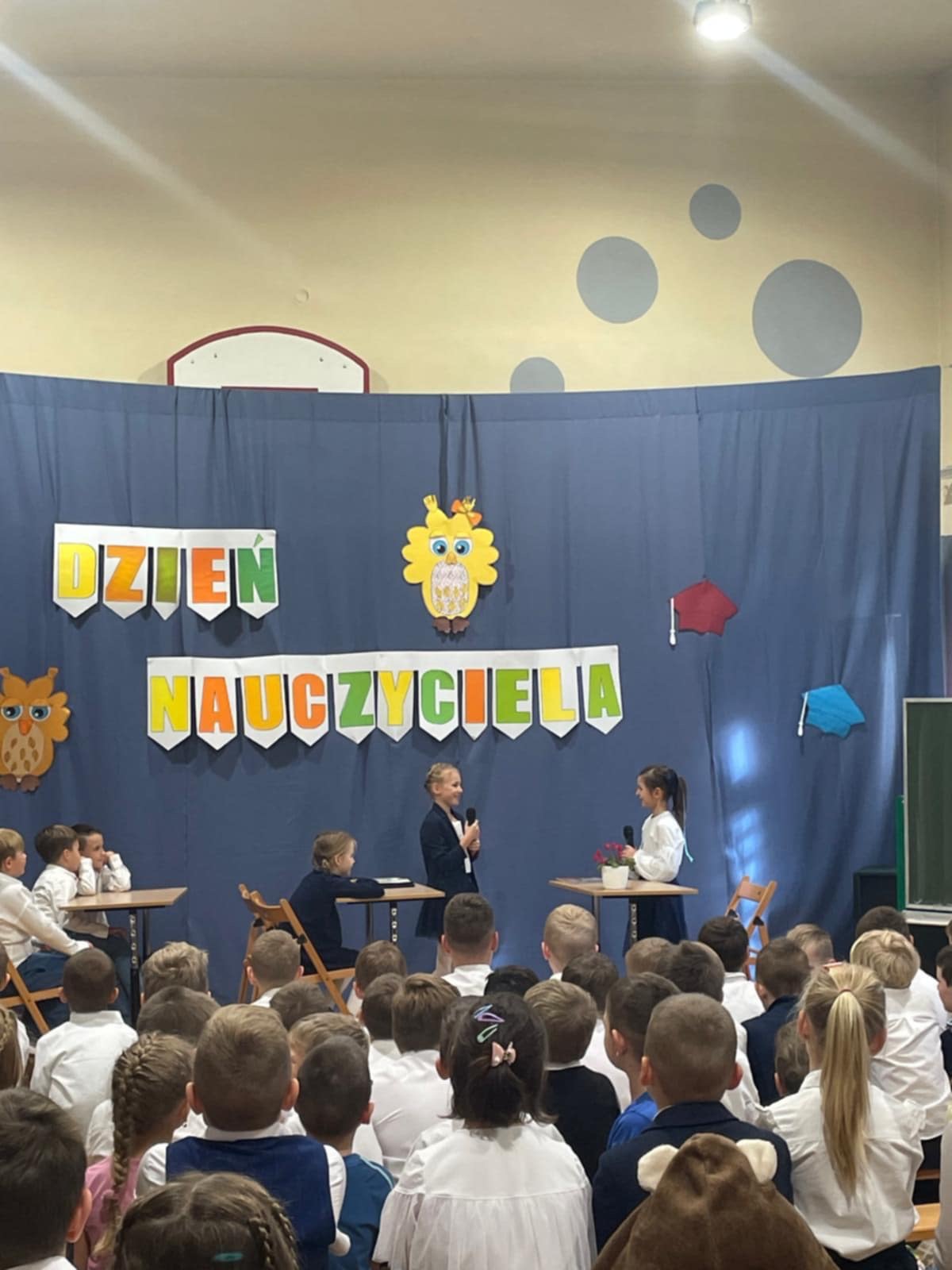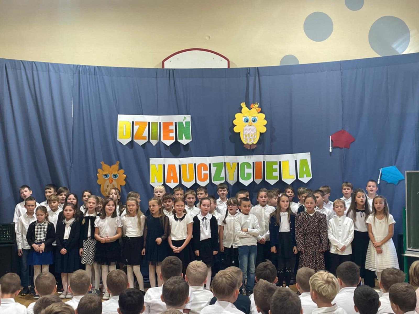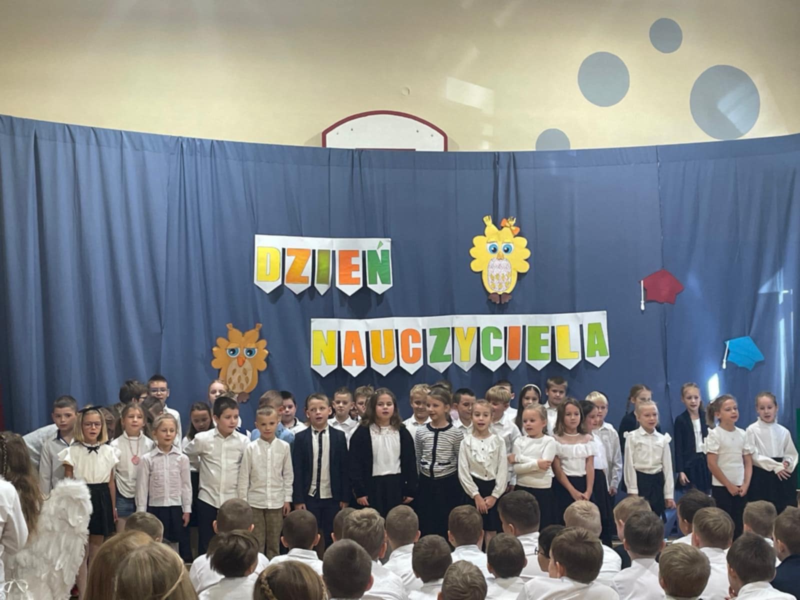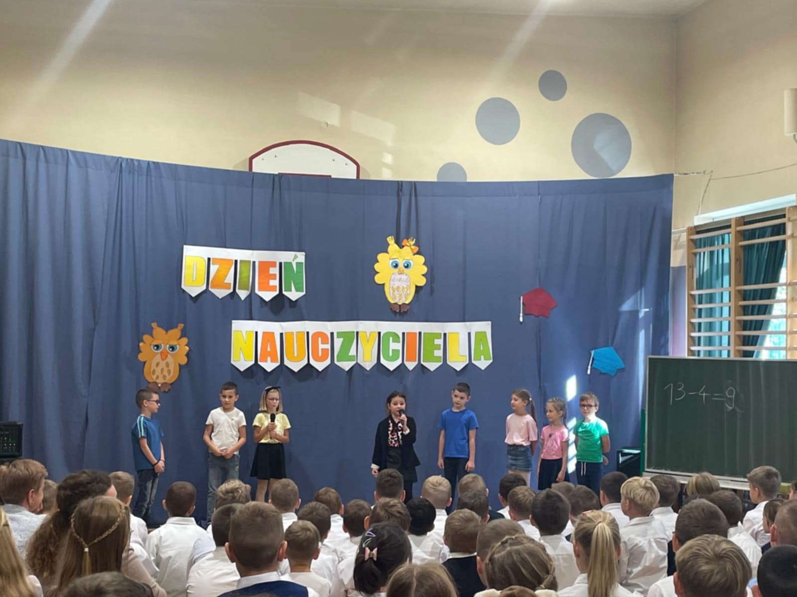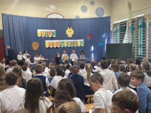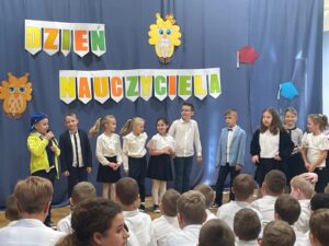 Z okazji Dnia Edukacji Narodowej uczniowie z klas 1-3 uczestniczyli we wspólnie przygotowanym apelu. Podczas spotkania każda grupowa wiekowa zaśpiewała piosenki o szkole. Przedstawiciele z poszczególnych klas wystąpili w humorystycznych scenkach nawiązujących do tradycji i życia szkolnego oraz wyrecytowali piękne wiersze z życzeniami dla nauczycieli.