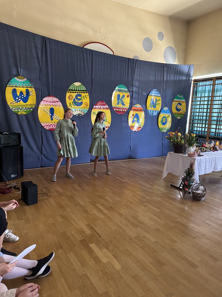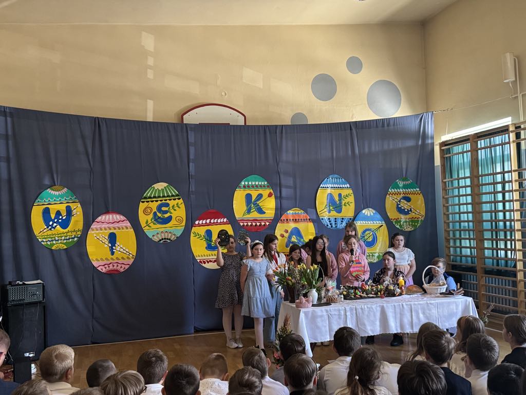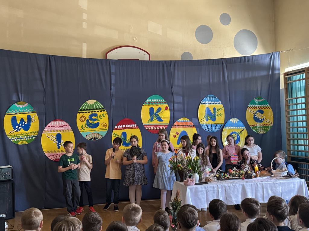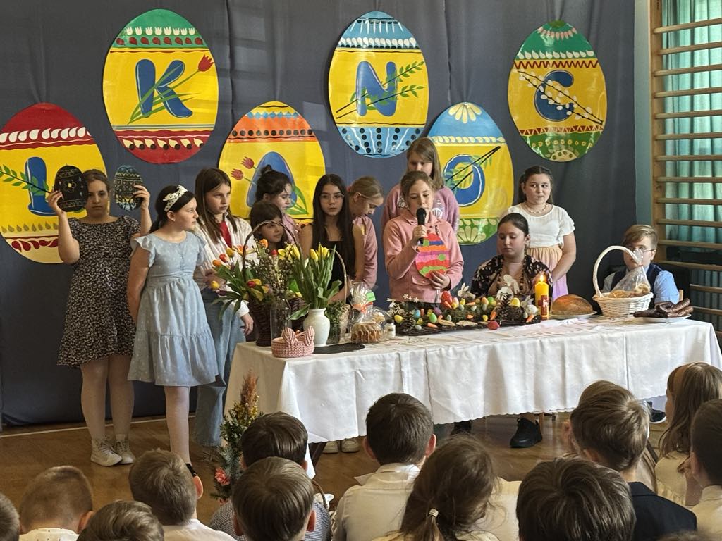 Dnia 16 kwietnia 2025r. klasa 4a zaprezentowała apel wielkanocny, który przybliżył społeczności szkolnej tradycje oraz symbole związane ze Świętami Wielkanocnymi. Uczniowie z zaangażowaniem opowiedzieli o najważniejszych zwyczajach wielkanocnych, takich jak święcenie pokarmów, przygotowywanie wielkanocnego śniadania, malowanie pisanek oraz śmigus-dyngus. W wystąpieniu pojawiły się także informacje o symbolice poszczególnych pokarmów: jajko jako znak nowego życia, chleb jako symbol Jezusa Chrystusa, sól jako oczyszczenie, a baranek jako symbol zwycięstwa dobra nad złem. Apel wzbogacił występ Marty i Magdy z klasy 6a, które wspaniała piosenką wprowadziły wszystkich w radosny, świąteczny nastrój. Przedstawienie naszych uczniów było nie tylko pięknym wstępem do Wielkanocy, ale również cenną lekcją o polskich tradycjach i wartościach.