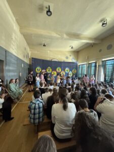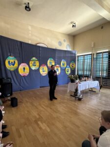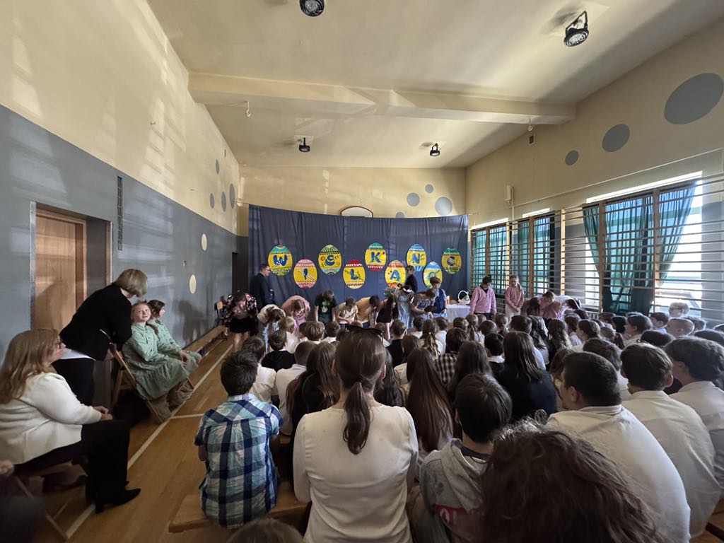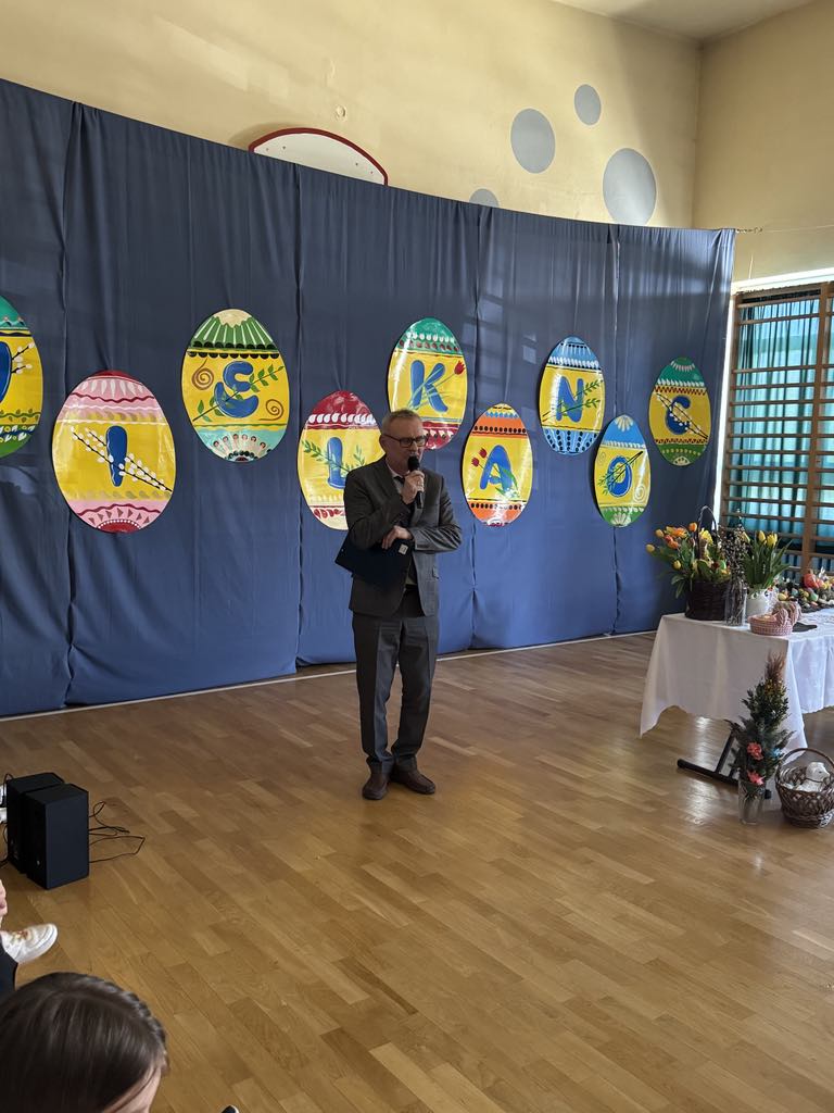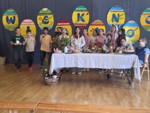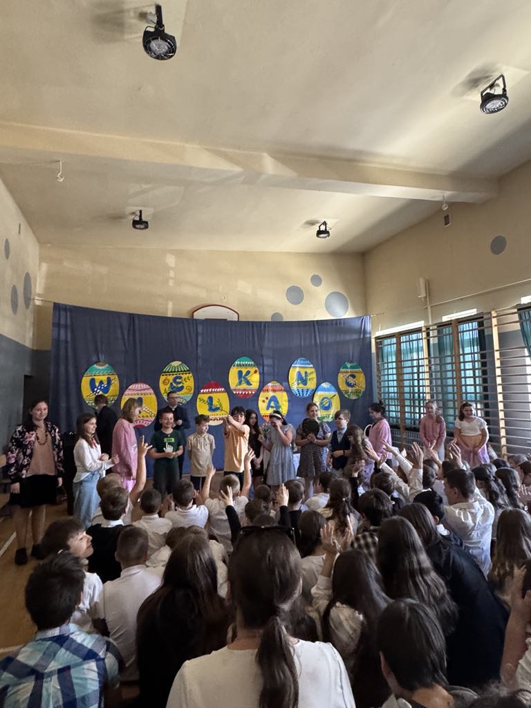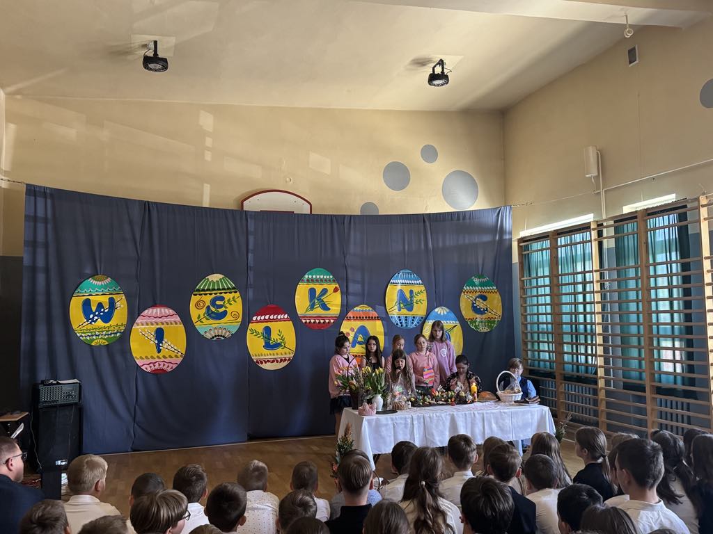 Dnia 16 kwietnia 2025r. klasa 4a zaprezentowała apel wielkanocny, który przybliżył społeczności szkolnej tradycje oraz symbole związane ze Świętami Wielkanocnymi. Uczniowie z zaangażowaniem opowiedzieli o najważniejszych zwyczajach wielkanocnych, takich jak święcenie pokarmów, przygotowywanie wielkanocnego śniadania, malowanie pisanek oraz śmigus-dyngus. W wystąpieniu pojawiły się także informacje o symbolice poszczególnych pokarmów: jajko jako znak nowego życia, chleb jako symbol Jezusa Chrystusa, sól jako oczyszczenie, a baranek jako symbol zwycięstwa dobra nad złem. Apel wzbogacił występ Marty i Magdy z klasy 6a, które wspaniała piosenką wprowadziły wszystkich w radosny, świąteczny nastrój. Przedstawienie naszych uczniów było nie tylko pięknym wstępem do Wielkanocy, ale również cenną lekcją o polskich tradycjach i wartościach.