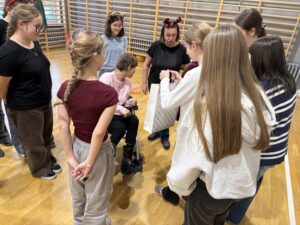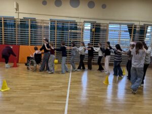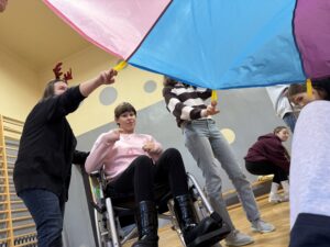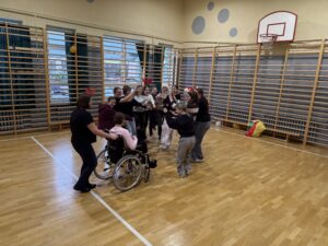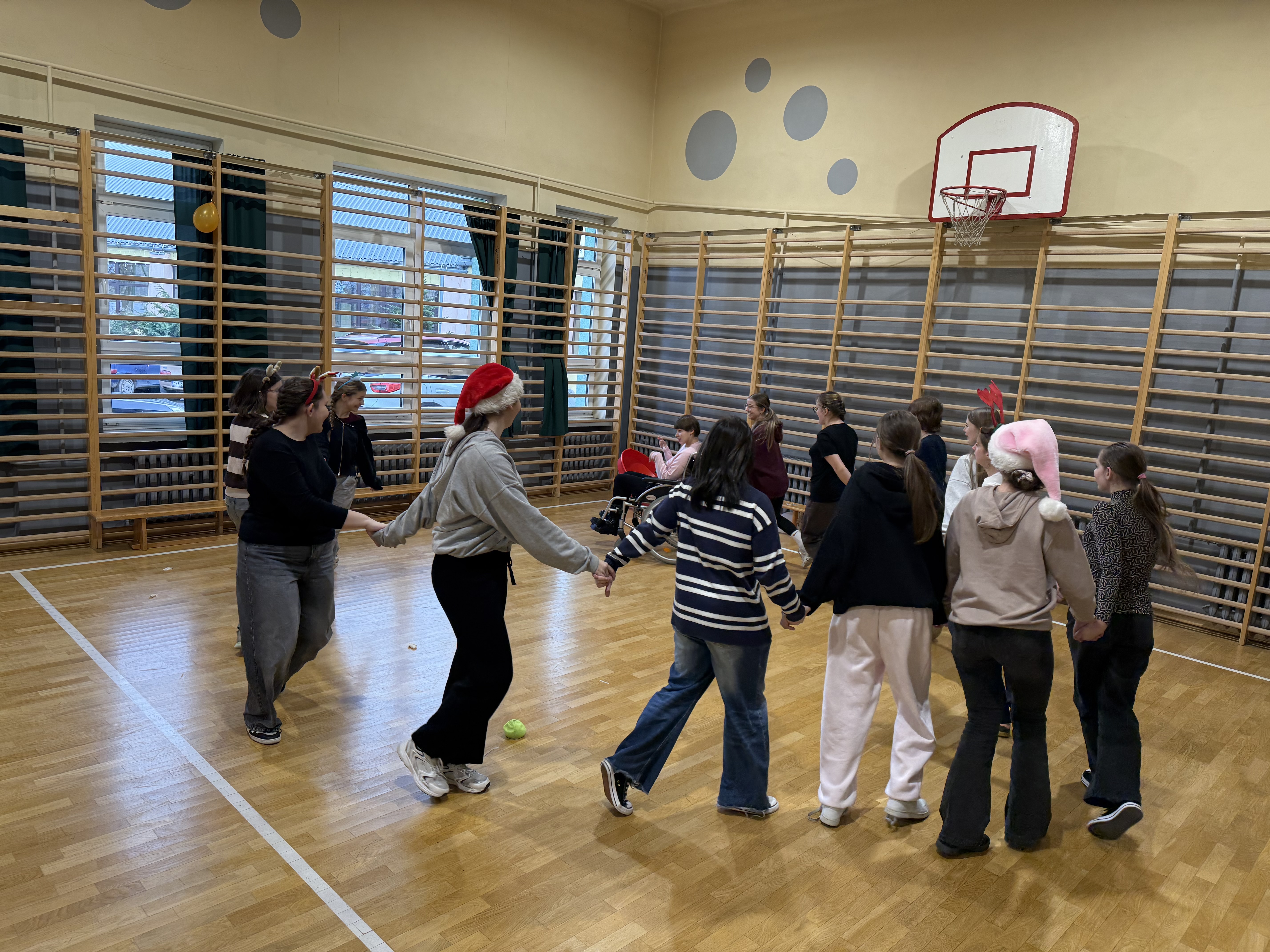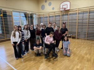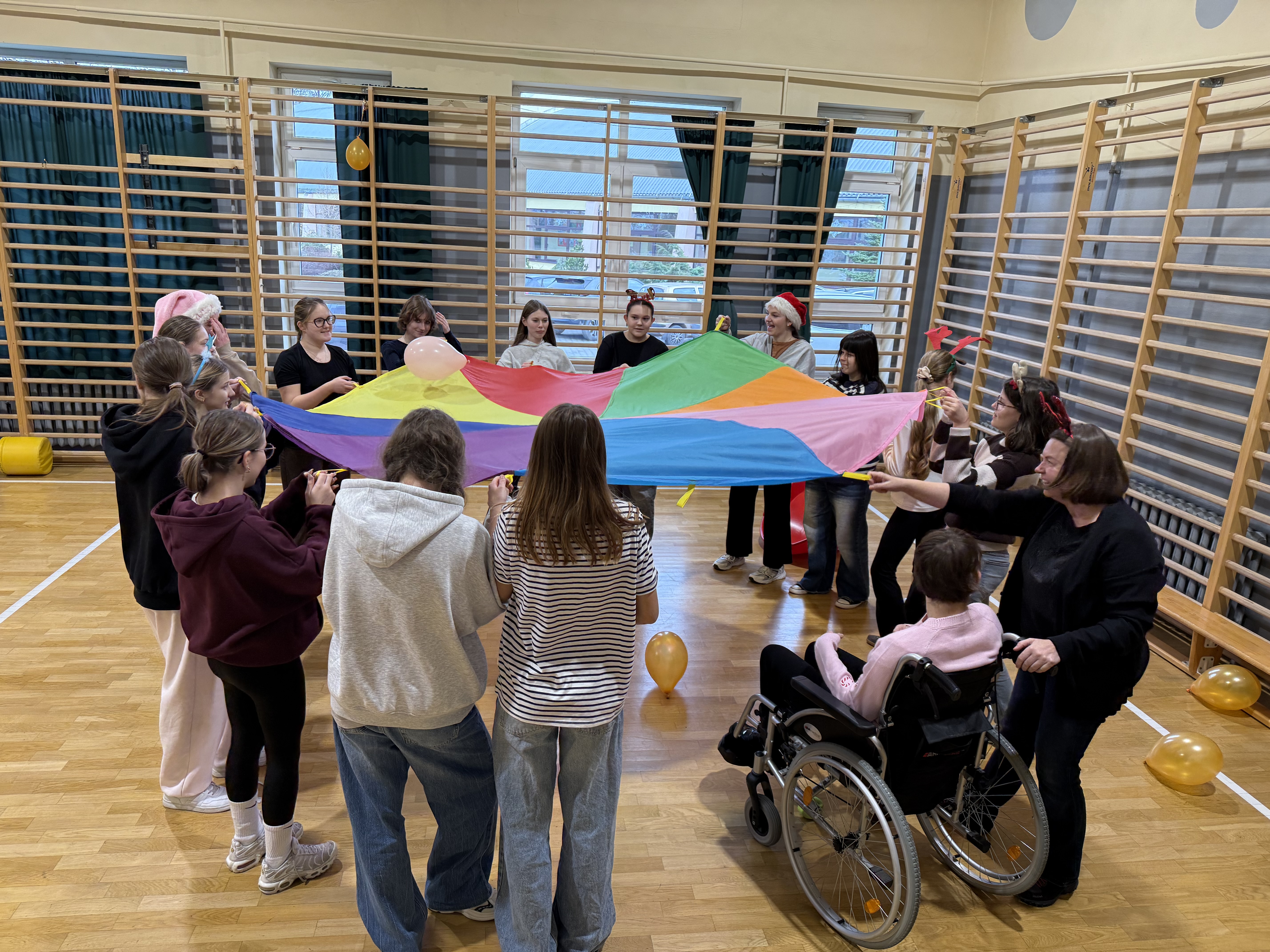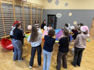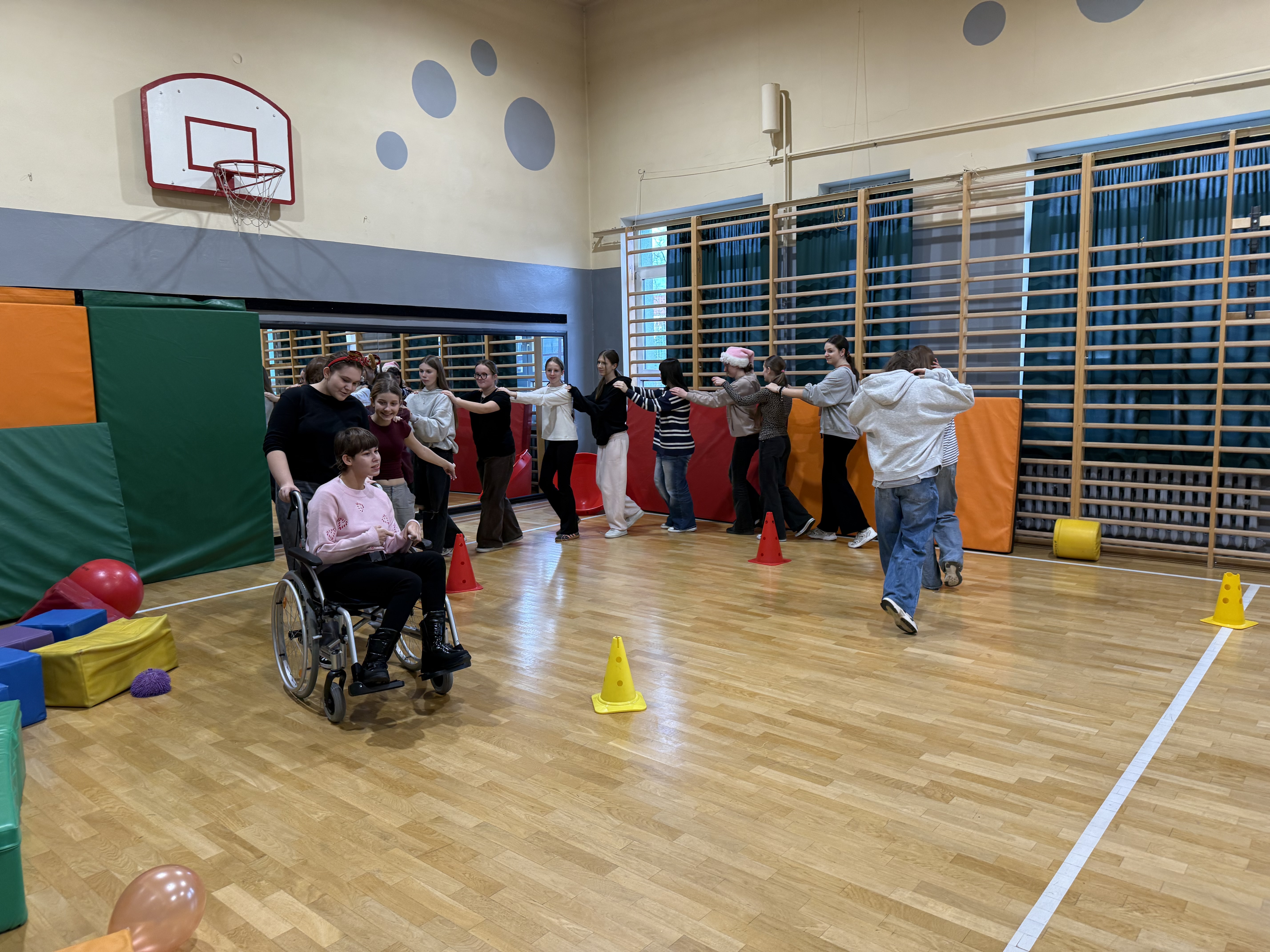 9 grudnia na sali gimnastycznej uczennice klasy 8a i 8b zorganizowały „Mikołajki na sportowo”, na których gościliśmy Kamilę, naszą uczennicę z niepełnosprawnością. Zaprosiliśmy ją do wspólnej zabawy: tańców, aktywności z chustą animacyjną oraz toru przeszkód. Na zakończenie wolontariuszki wręczyły prezent dla Kamili oraz upamiętniliśmy wydarzenie wspólnym zdjęciem. Dziewczyny również otrzymały słodki drobny upominek od Pani Basi. Serdecznie dziękujemy za zaangażowanie – widzimy się w przyszłym roku❤️