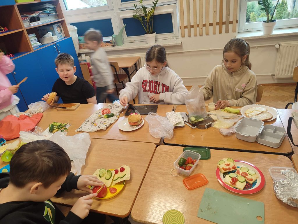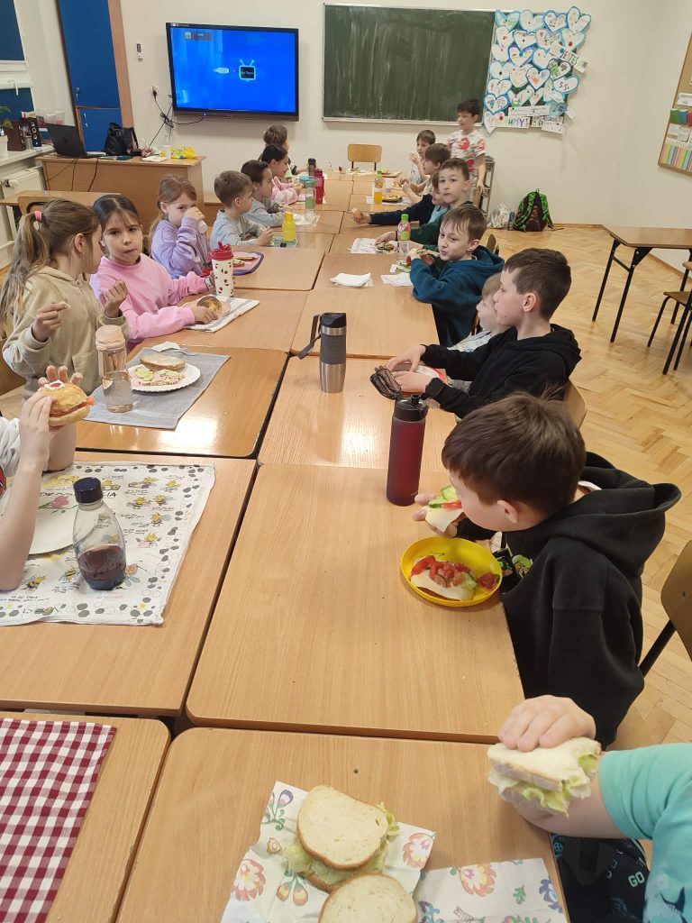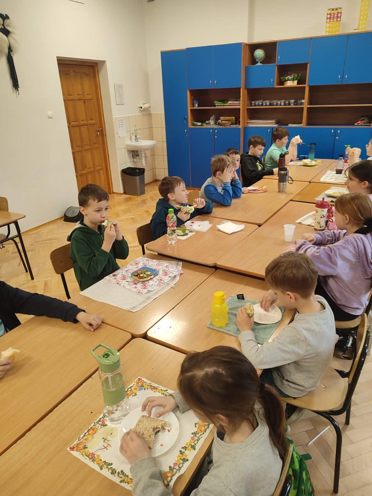 W czwartek w klasie 2a odbyło się Wiosenne przyjęcie. Dzieci przyniosly swoje ulubione produkty, z których przygotowały pyszne, kolorowe kanapki. Zajęcia poprzedzała rozmowa na temat zdrowego odżywiania, dlaczego warto jeść warzywa, co to są witaminy i jakie mają znaczenie dla naszego zdrowia. Przyjemnie było usiąść przy wspólnym stole i razem spożyć posiłek.